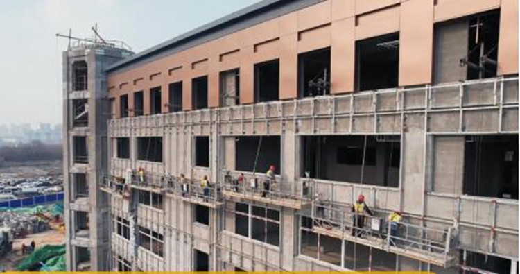 幕墻安裝——是該項(xiàng)目的又一大難題,而解決它的前置條件就是吊籃的架設(shè)!經(jīng)測(cè)算,該工程的吊籃使用量不低于500臺(tái)。為此,項(xiàng)目部提前組織觀摩多個(gè)吊籃公司,制定方案。吊籃安裝時(shí)正值室外開挖埋管時(shí)期,項(xiàng)目部夜間加班,通過先組裝后吊裝的方式,有效地解決了工作面交叉作業(yè)的問題。從2022年1月6日12#、14#宿舍樓的第一批吊籃安裝開始,500多臺(tái)吊籃從告知到驗(yàn)收再到使用登記,項(xiàng)目部加班加點(diǎn)僅用20天就完成了工作,使吊籃的整體使用時(shí)間比預(yù)期縮短了15天。科創(chuàng)中心樓位于項(xiàng)目西南角、南大門西側(cè),正處于形象展示樣板區(qū)域,春節(jié)前必須安裝到位。當(dāng)時(shí)已近年關(guān),大量的勞務(wù)人員已踏上返鄉(xiāng)的路程。為了不影響項(xiàng)目進(jìn)度,項(xiàng)目部與吊籃租賃公司多次溝通協(xié)調(diào),動(dòng)之以情,曉之以理,最終在年前把第一批吊籃架設(shè)成功,并順利通過驗(yàn)收,為節(jié)點(diǎn)性樣板間的按期完工奠定了基礎(chǔ)。把一切能提前、能加班完成的工作提前完成、加班完成——這是項(xiàng)目所有人的統(tǒng)一思想。