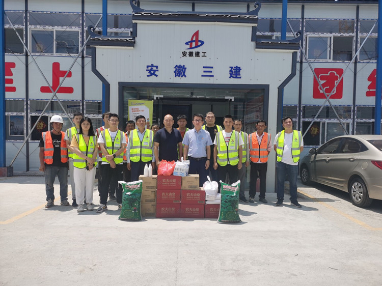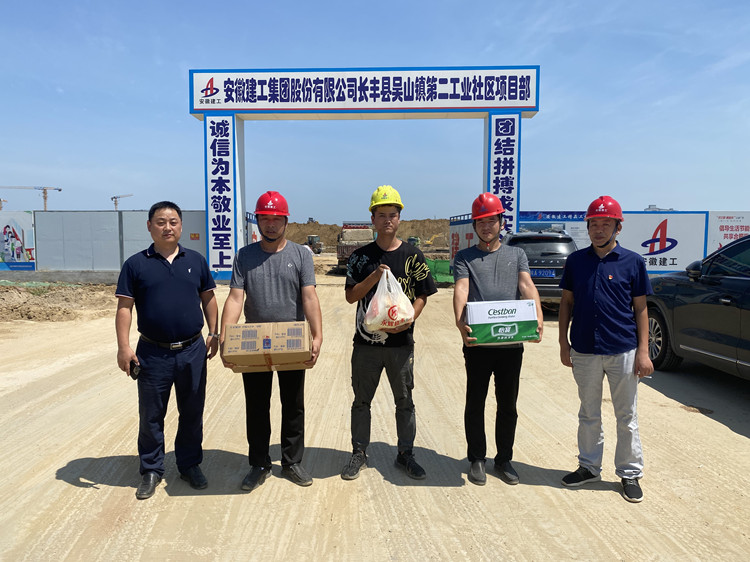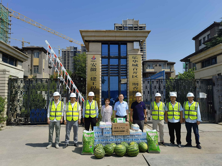 自7月13日開始,基礎(chǔ)公司領(lǐng)導(dǎo)班子成員先后前往長豐縣吳山鎮(zhèn)第二社區(qū)等6個(gè)項(xiàng)目開展送清涼活動(dòng),為在高溫下作業(yè)的一線工作人員送去礦泉水、綠豆、白糖、藿香正氣水等防暑降溫用品,給他們送去烈日下的清涼和關(guān)懷。 基礎(chǔ)公司經(jīng)理、支部書記袁學(xué)明代表基礎(chǔ)公司,對奮戰(zhàn)在項(xiàng)目一線正在進(jìn)行工程基礎(chǔ)施工的項(xiàng)目職工進(jìn)行了慰問,同時(shí)提醒大家要靈活安排工作,注重崗位安全,在工作的同時(shí)要注意防暑降溫,增強(qiáng)自我安全防范意識(shí),確保身體健康。