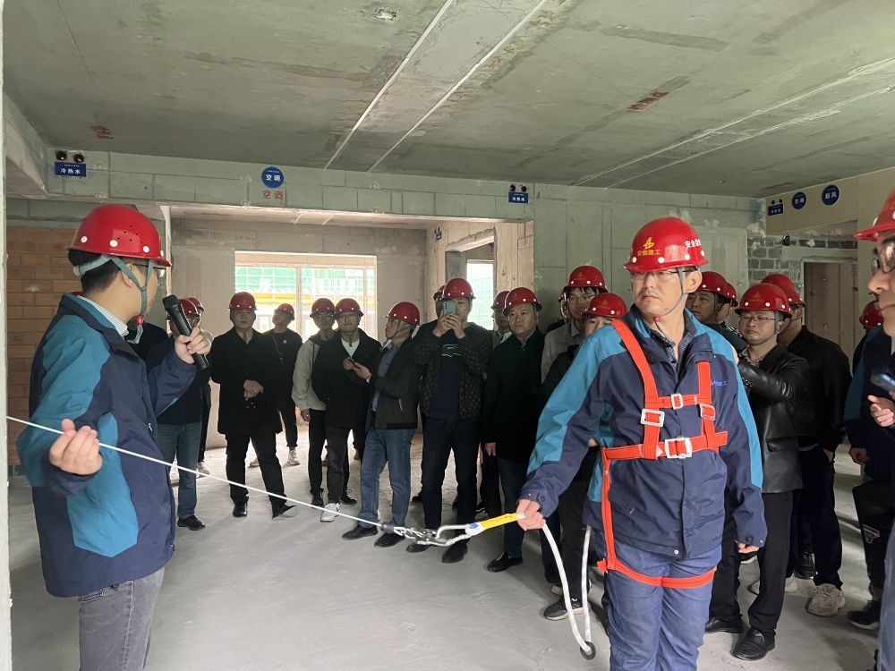 觀摩人員一行聽取了項目工程概況以及質量、成本、安全等方面管控措施的匯報,重點參觀了項目智慧展廳、5#樓樣板間、機器人停放區(qū)及施工作業(yè)層,并就項目相關亮點做法進行深度交流,項目經理姜正寶就安全管控措施及主體結構施工工藝與觀摩人員進行詳細探討。