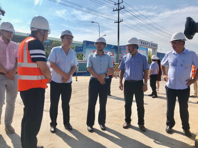 圖為黃韡一行在施工現(xiàn)場(chǎng)查看施工進(jìn)展情況并指導(dǎo)工作