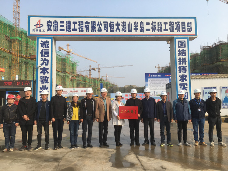 2019年11月8日上午,公司“工人先鋒號(hào)”驗(yàn)評(píng)小組一行前往十一公司天長(zhǎng)恒大湖山半島項(xiàng)目,對(duì)項(xiàng)目申報(bào)的安徽三建“工人先鋒號(hào)”進(jìn)行驗(yàn)評(píng)并授牌。