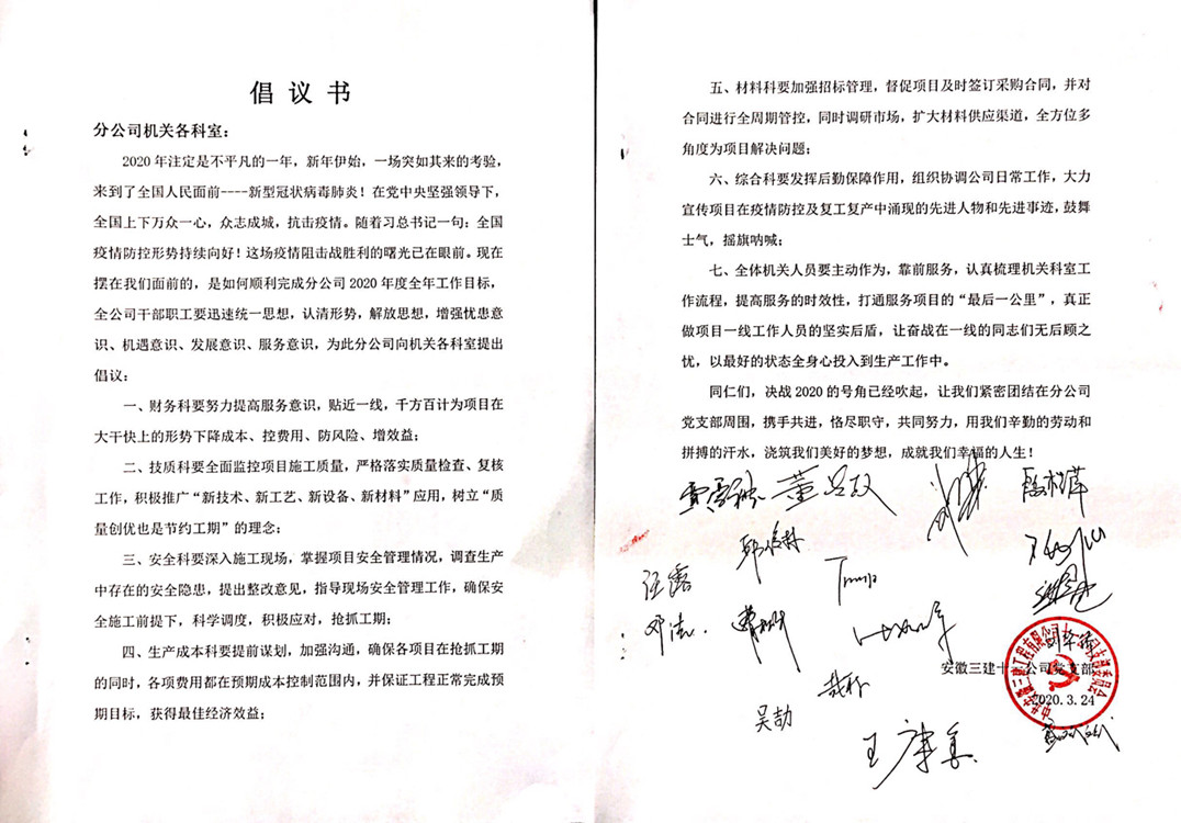 面對疫情的影響,十一公司堅定信心決定,咬定目標不放松,鼓干勁,見行動。3月24日,十一公司黨支部在分公司范圍內(nèi)發(fā)起倡議書,要求全體職工要迅速統(tǒng)一思想,認清形勢,立足本職崗位,及時有效的完成自己的工作,為了順利完成分公司2020年全年工作目標努力拼搏。