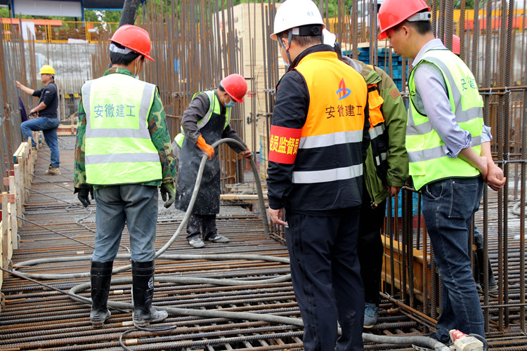 澆筑施工過程中,各班組之間密切配合,項(xiàng)目部管理人員全程跟班作業(yè),全過程旁站、把控和指導(dǎo),嚴(yán)控澆筑順序、振搗方式等,黨員監(jiān)督崗?fù)倦S機(jī)監(jiān)督,派駐商混站管理人員緊盯原料、外加劑投放質(zhì)量及運(yùn)輸車次,確保澆筑連續(xù)性,嚴(yán)格把控質(zhì)量關(guān)。由于策劃細(xì)致,合肥中心圖書館項(xiàng)目大體積混凝土澆筑順利完成,目前混凝土測溫及養(yǎng)護(hù)工作正在有序開展。