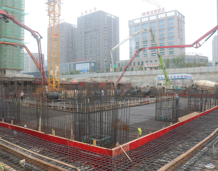此次澆筑的是“雙子樓”中的高188米A樓,A樓筏板基礎(chǔ)長(zhǎng)方形承臺(tái)長(zhǎng)51米、寬42米、最厚處達(dá)7米,面積相當(dāng)于5個(gè)標(biāo)準(zhǔn)籃球場(chǎng)大小,項(xiàng)目部共動(dòng)用混凝土泵車(chē)5臺(tái)、使用鋼筋約600噸,共澆筑7000多立方米混凝土。