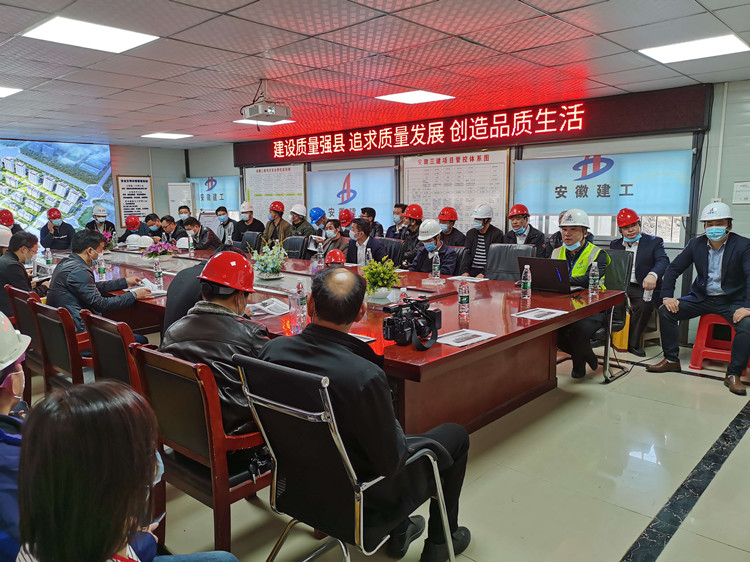 在項目會議室,項目負責人高劍介紹了項目工程概況,重點介紹了項目在質(zhì)量、安全等方面管理措施以及施工亮點等。隨后,全體觀摩人員深入項目施工現(xiàn)場,觀摩了項目現(xiàn)場工程質(zhì)量及安全文明相關(guān)措施,相關(guān)領(lǐng)導(dǎo)對項目現(xiàn)場的各項管控措施及取得的成績給予了高度的評價,并充分肯定了安徽三建作為國有企業(yè)的責任意識和擔當精神。