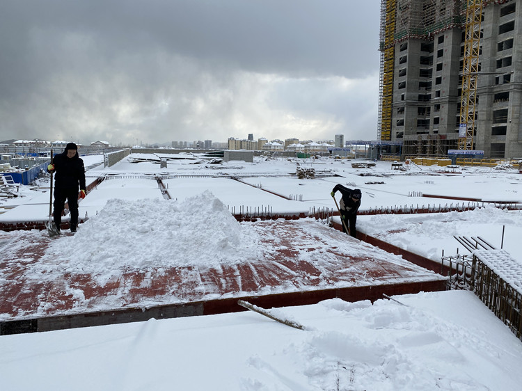 當(dāng)天,項(xiàng)目管理人員積極響應(yīng),無畏嚴(yán)寒,帶上鐵鍬、鏟子和掃把等工具趕赴施工現(xiàn)場,過程中大家配合默契,分工明確,零下五度卻汗流浹背。很快道路、材料堆放場地、樓層頂板等積雪面積越來越小,工作面越來越大。