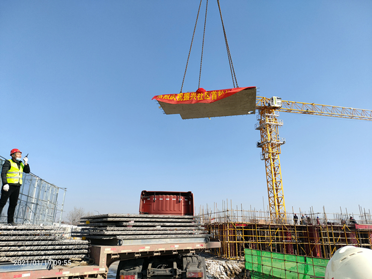 2021年1月18日,隨著一塊3.2米×2米,重達0.99噸的鋼筋混凝土預(yù)制構(gòu)件緩緩吊起,在4#樓一層準確就位,十二公司肥東振興EPC項目PC構(gòu)件首吊成功,意味著安徽三建十二公司裝配式建筑全面進入實施階段,在產(chǎn)業(yè)化建設(shè)上又邁出了新的一步。