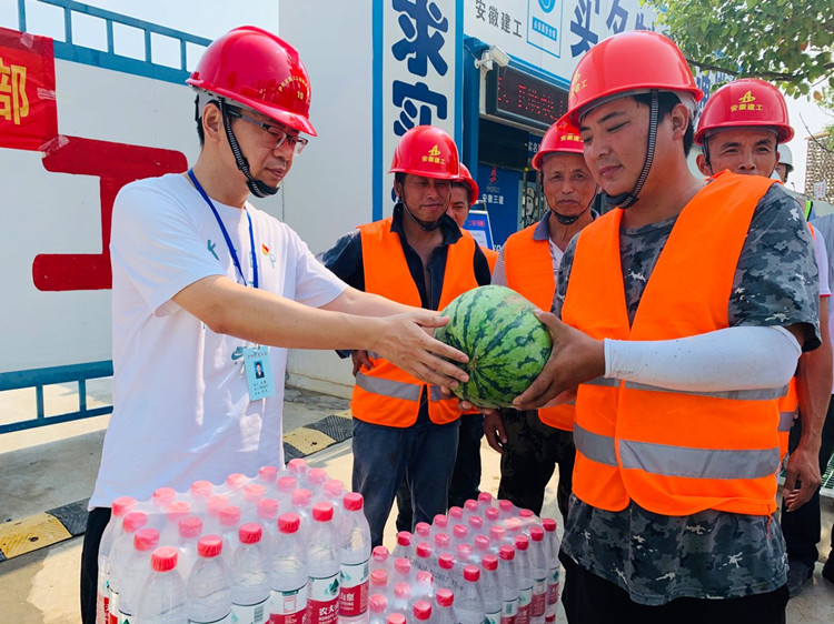 阮灝一行對工友表示慰問,向大家不畏高溫、辛勤工作表示感謝,叮囑大家要合理調(diào)整作息時間,確保身體健康,防止中暑,并為大家送來了西瓜、礦泉水等防暑降溫慰問品;同時要求項目負責人要加強安全管理,合理安排施工工期,在保進度、保質(zhì)量的同時,也要保障員工的身體健康,與監(jiān)理單位切實做好防暑降溫和安全生產(chǎn)工作。