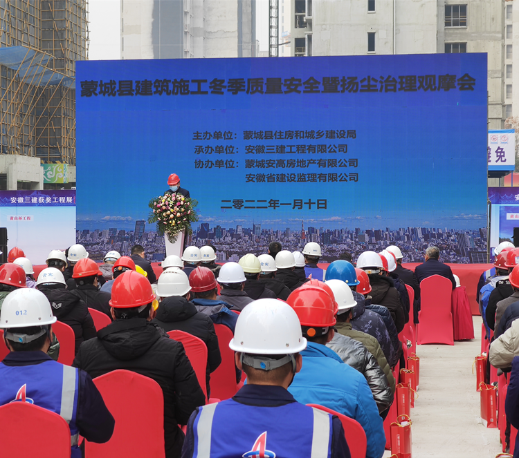 為切實(shí)做好蒙城縣建筑工程冬季施工質(zhì)量安全及揚(yáng)塵治理管理工作,加強(qiáng)施工現(xiàn)場(chǎng)管理經(jīng)驗(yàn)的學(xué)習(xí)與交流,提高從業(yè)人員質(zhì)量安全生產(chǎn)意識(shí),推進(jìn)質(zhì)量安全生產(chǎn)標(biāo)準(zhǔn)化工作落實(shí)到位,1月10日上午,蒙城縣建筑施工冬季質(zhì)量安全暨揚(yáng)塵治理觀摩會(huì)在安徽三建承建的蒙城高速時(shí)代首府項(xiàng)目順利召開。 蒙城縣副縣長(zhǎng)劉鵬,縣住建局、應(yīng)急管理局、人社局等相關(guān)部門負(fù)責(zé)人以及全縣所有在建項(xiàng)目業(yè)主代表、項(xiàng)目經(jīng)理、總監(jiān)約200人參會(huì)。