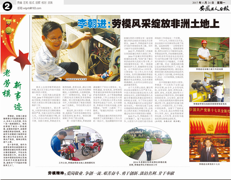 安徽工人日報(bào)——李朝進(jìn):勞模風(fēng)采綻放非洲土地上 發(fā)布時(shí)間:2017-10-22 來源:安徽工人日報(bào) 撰稿人:汪利民 瀏覽次數(shù):12535