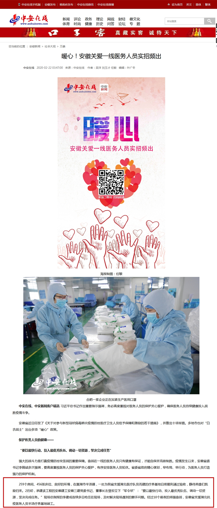中安在線、央廣網(wǎng)、中新網(wǎng)、國際在線——暖心!安徽關(guān)愛一線醫(yī)務(wù)人員實招頻出 發(fā)布時間:2020-02-26 來源:中安在線、央廣網(wǎng)、中新網(wǎng)、國際在線 撰稿人: 瀏覽次數(shù):14825 網(wǎng)址鏈接: 中安在線:http://ah.anhuinews.com/system/2020/02/22/008352394.shtml 央廣網(wǎng):http://news.cnr.cn/native/gd/20200222/t20200222_524987284.shtml 中新網(wǎng):http://www.chinanews.com/sh/2020/02-22/9101239.shtml 國際在線: http://news.cri.cn/20200222/6faa4074-5d1b-ef06-5944-b8a7ca8d5931.html