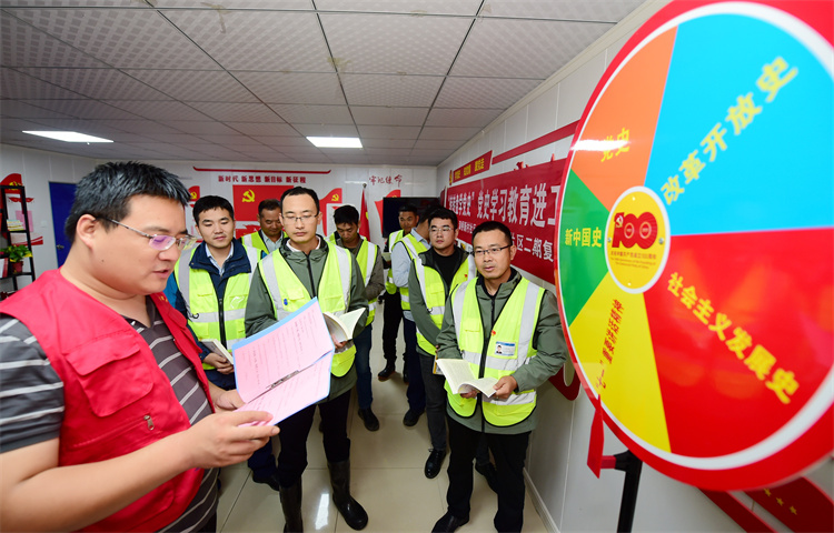 “支部建在項目上”。公司一直以來堅持項目黨組織、黨支部書記、黨建工作制度與項目部管理架構(gòu)同步建立、同步配備、同步落實,做到哪里有建設(shè)項目,黨建工作就延伸到哪里,為項目生產(chǎn)經(jīng)營與黨建工作的同步開展提供了全方位的融入機制。五里片區(qū)項目作為公司項目黨支部之一,從建立開始,項目就把紅色理念引進(jìn)工地帶到一線職工身邊,積極組織項目員工參加公司、分公司組織的各項黨建活動,極大地增強了團隊的凝聚力。同時項目黨支部還開展各種紅色觀影、紅色教育等活動,極大地激發(fā)了廣大黨員和職工的愛國情懷。