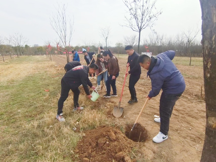 植樹現(xiàn)場,黨員和青年志愿者們分工協(xié)作、配合默契,揮鍬鏟土、踩實新泥,大家熱情高漲,干勁十足,現(xiàn)場一片繁忙有序,熱火朝天的景象。