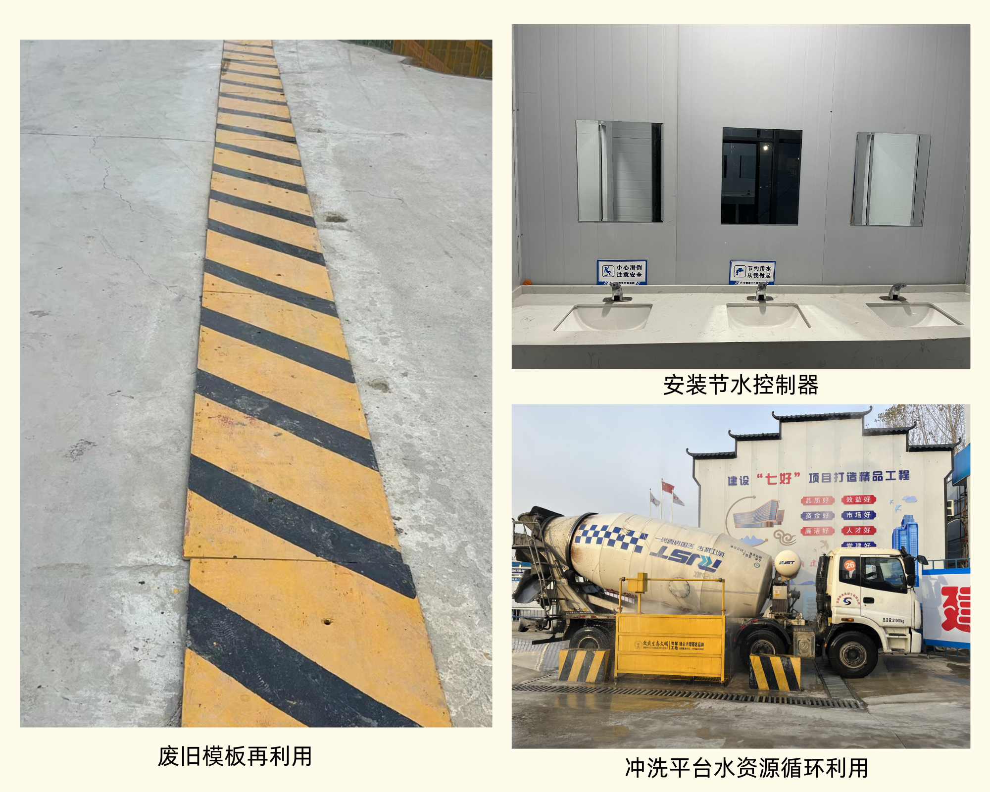 一分公司項(xiàng)目采取廢舊模板再利用,將廢舊模版刷漆亮化后放在后澆帶上,避免出現(xiàn)踩空等安全隱患;衛(wèi)生間安裝節(jié)水控制器節(jié)約水資源;沖洗平臺通過水資源循環(huán)利用,達(dá)到節(jié)約水資源的目的。