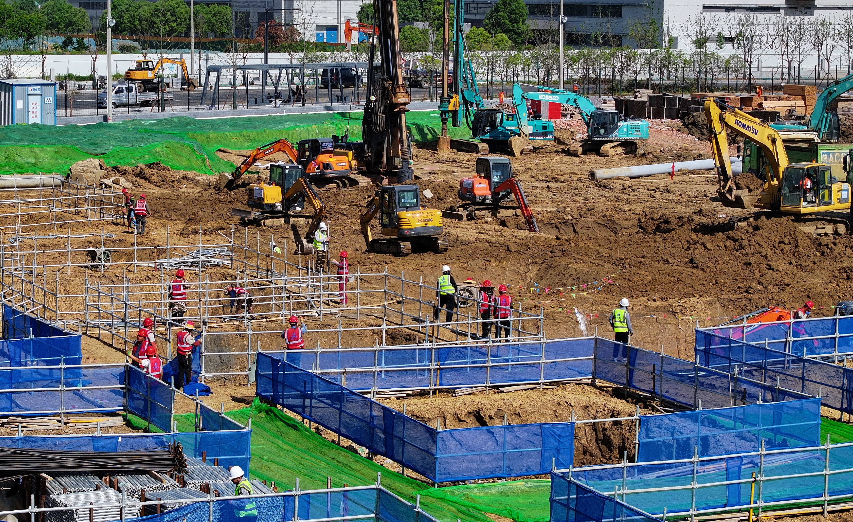 大眾科技三期項(xiàng)目自開工以來(lái),為了搶工期、保進(jìn)度,安徽建工三建集團(tuán)采取果斷措施,抽調(diào)40名實(shí)踐經(jīng)驗(yàn)豐富的項(xiàng)目管理人員、245名一線施工人員參與到項(xiàng)目建設(shè)當(dāng)中,同時(shí),集中調(diào)用樁機(jī)12臺(tái)、挖掘機(jī)26臺(tái)、車輛24輛、推土機(jī)3臺(tái),共投入65臺(tái)大型機(jī)械設(shè)備組成大規(guī)?!皺C(jī)械戰(zhàn)隊(duì)”,全方位開展施工作業(yè)。