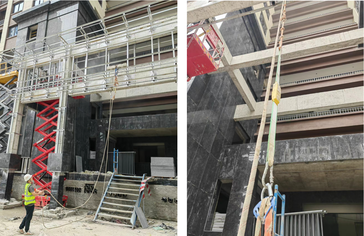 項目部在“安全生產(chǎn)月”期間加大巡查力度,對作業(yè)前的安全準備工作詳細策劃并指導(dǎo)實施。項目正值外墻裝飾階段施工,安全員在提醒作業(yè)人員系掛安全帶的基礎(chǔ)上,定期對采購的安全帶防墜落緩沖包進行試拉試驗,驗收合格后方可使用。同時對作業(yè)人員進行交底,包括安全帶的正確配置、系掛點的位置選擇、安全繩移動距離及有效長度等。