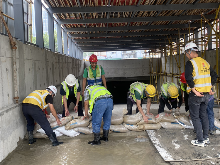 該演練模擬暴雨天氣,項(xiàng)目部內(nèi)降水過大,可能會(huì)引發(fā)雨水灌入車庫,項(xiàng)目管理人員發(fā)現(xiàn)險(xiǎn)情滯后,項(xiàng)目部立即組織管理人員,啟動(dòng)防汛應(yīng)急預(yù)案,各應(yīng)急小組進(jìn)入防汛抗洪搶險(xiǎn)工作。防汛抗洪小組組織裝運(yùn)沙袋至地庫入口進(jìn)行封堵;同時(shí)疏散小組有序組織車庫作業(yè)人員進(jìn)行疏散及撤離。