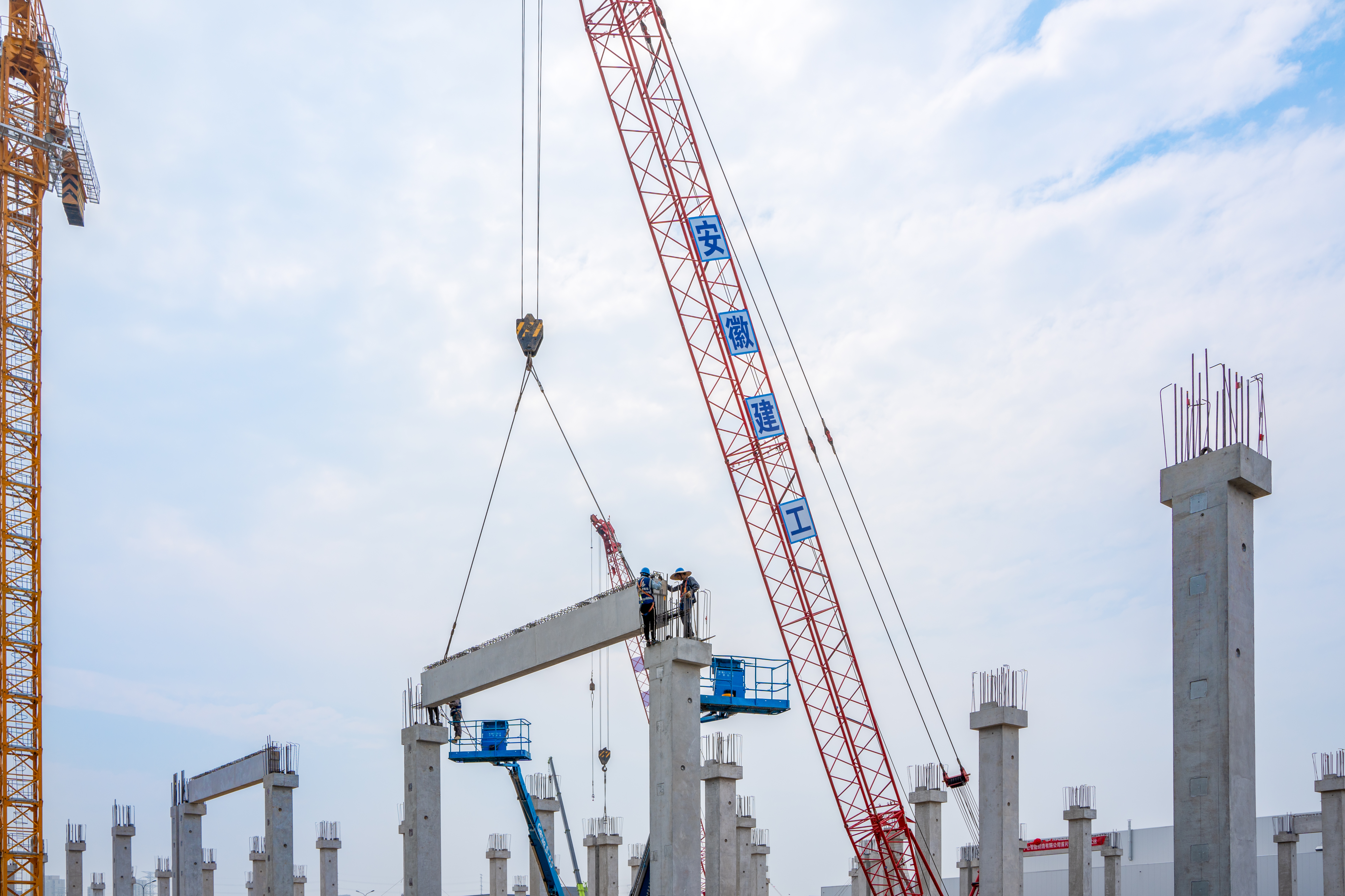 在項(xiàng)目施工過程中,預(yù)制梁和鋼桁架的吊裝是一個(gè)技術(shù)難度較高的工作。預(yù)制梁和鋼桁架的體積大、重量重,對吊裝設(shè)備和操作人員的技術(shù)水準(zhǔn)提出了較高的要求。在大眾科技研發(fā)三期項(xiàng)目預(yù)制梁和臨湖智能制造產(chǎn)業(yè)園項(xiàng)目鋼桁架吊裝環(huán)節(jié)中,項(xiàng)目團(tuán)隊(duì)進(jìn)行了科學(xué)合理的統(tǒng)籌規(guī)劃,對施工現(xiàn)場進(jìn)行全方位勘察,精心計(jì)算每一項(xiàng)吊裝參數(shù),充分預(yù)估可能出現(xiàn)的各種風(fēng)險(xiǎn),力保每一步吊裝操作都精確無誤。與此同時(shí),施工團(tuán)隊(duì)還制定了完備的風(fēng)險(xiǎn)應(yīng)對預(yù)案,以預(yù)防突發(fā)狀況的發(fā)生。他們不僅投入先進(jìn)的設(shè)備,還注重施工人員的技能與團(tuán)隊(duì)協(xié)作。最終,施工團(tuán)隊(duì)?wèi){借著精湛的技藝和頑強(qiáng)的拼搏精神,成功攻破項(xiàng)目預(yù)制梁、鋼桁架吊裝技術(shù)難點(diǎn),展示了“江淮鐵軍”的技術(shù)實(shí)力和嚴(yán)謹(jǐn)態(tài)度。