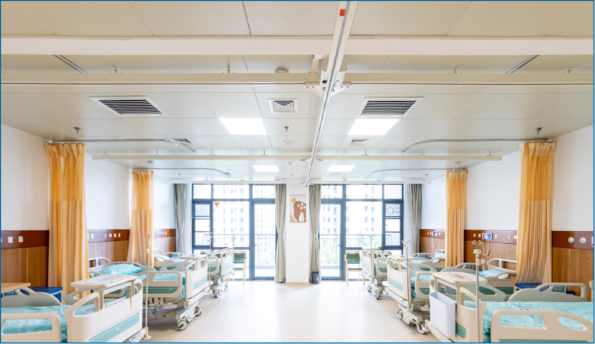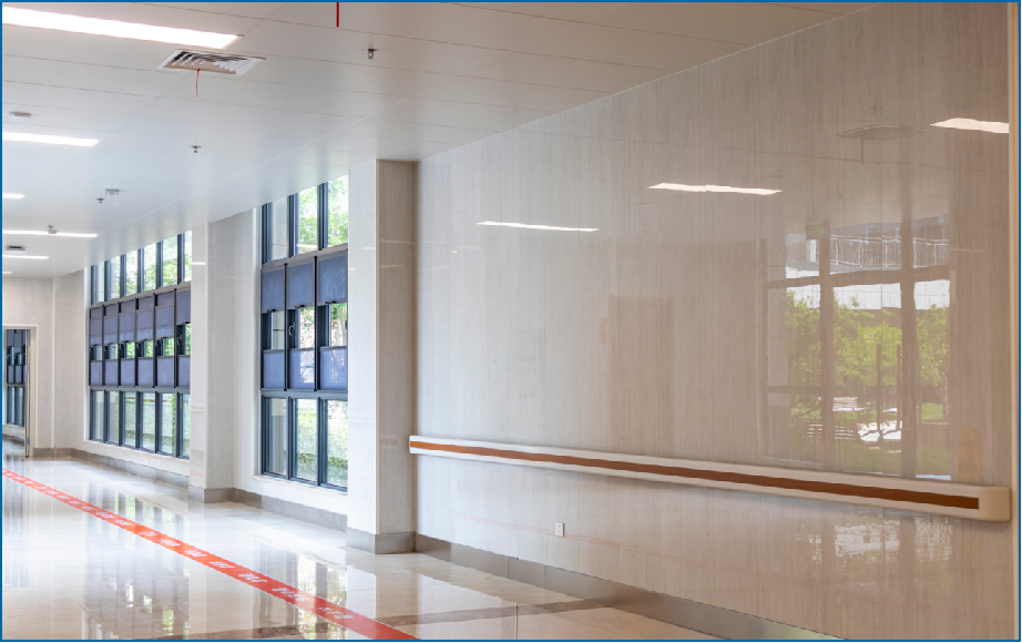 設(shè)計上,摒棄了傳統(tǒng)醫(yī)院病房樓的直通式走廊,形成類似“街道+廣場”的空間,成為充滿生活氛圍的社區(qū)交往空間,延續(xù)家居感覺。根據(jù)不同使用人群(失能、失智老年人、自理老人)的需求,設(shè)置不同的配套服務(wù)功能,以康養(yǎng)軸連接南、北、中部各功能模塊,利用無障礙人行通道形成風(fēng)雨無阻的步行系統(tǒng)。設(shè)置智能適老化看護(hù)管理系統(tǒng)和無障礙智能載人天軌系統(tǒng),施工策劃全面考慮運營需求,確保系統(tǒng)平穩(wěn)運行且無交叉、無干擾。