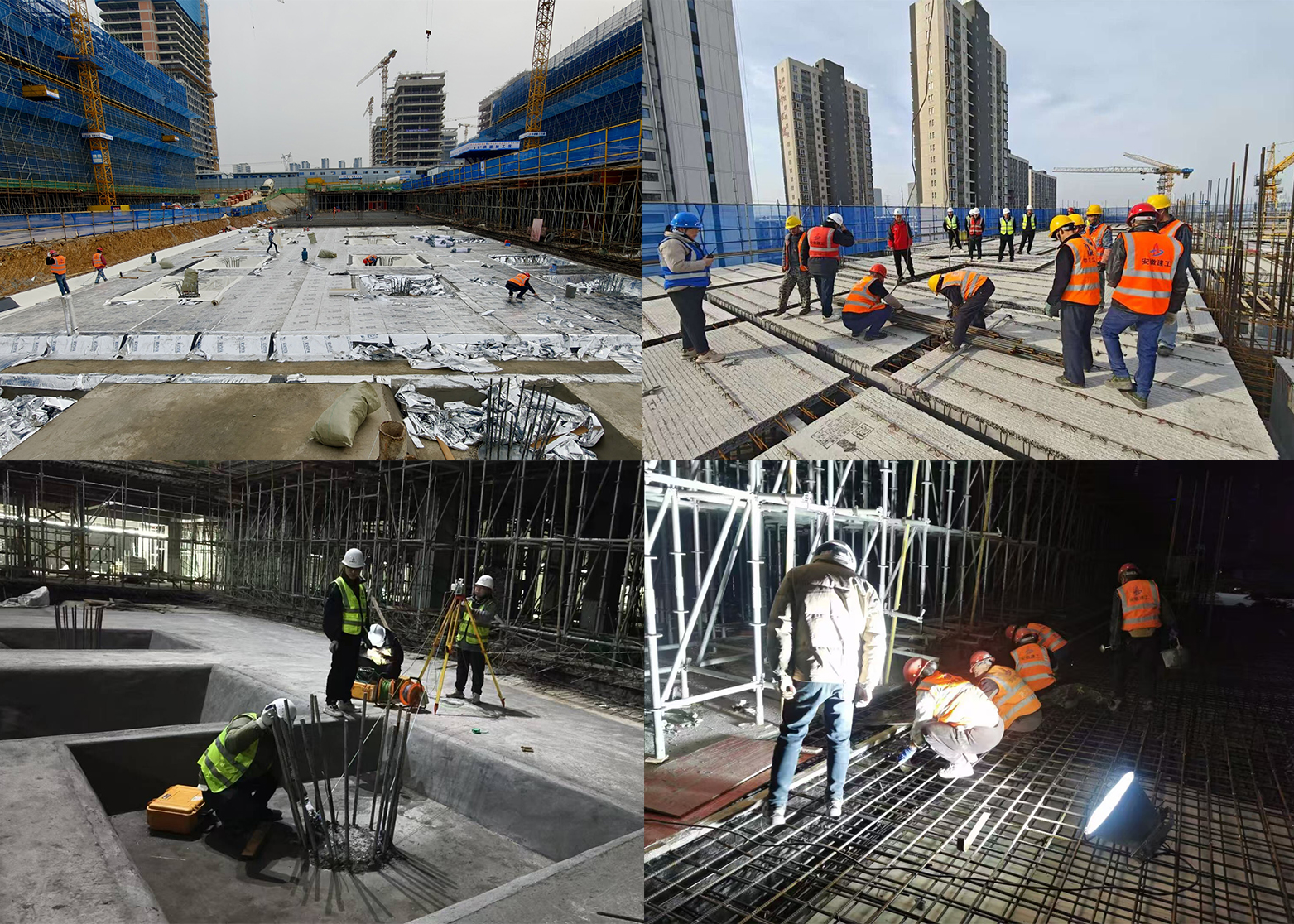 春節(jié)復(fù)工后,項目部開足馬力,緊抓C04#樓屋面吊模模板拆除及清理工作,C05#樓、B06#樓鋁模板面拼裝、混凝土澆筑,以及地庫S15段頂板模板鋪設(shè)、N4段內(nèi)架搭設(shè)、N5段頂板模板鋪設(shè),確保了工程全面進(jìn)入正常施工狀態(tài)。