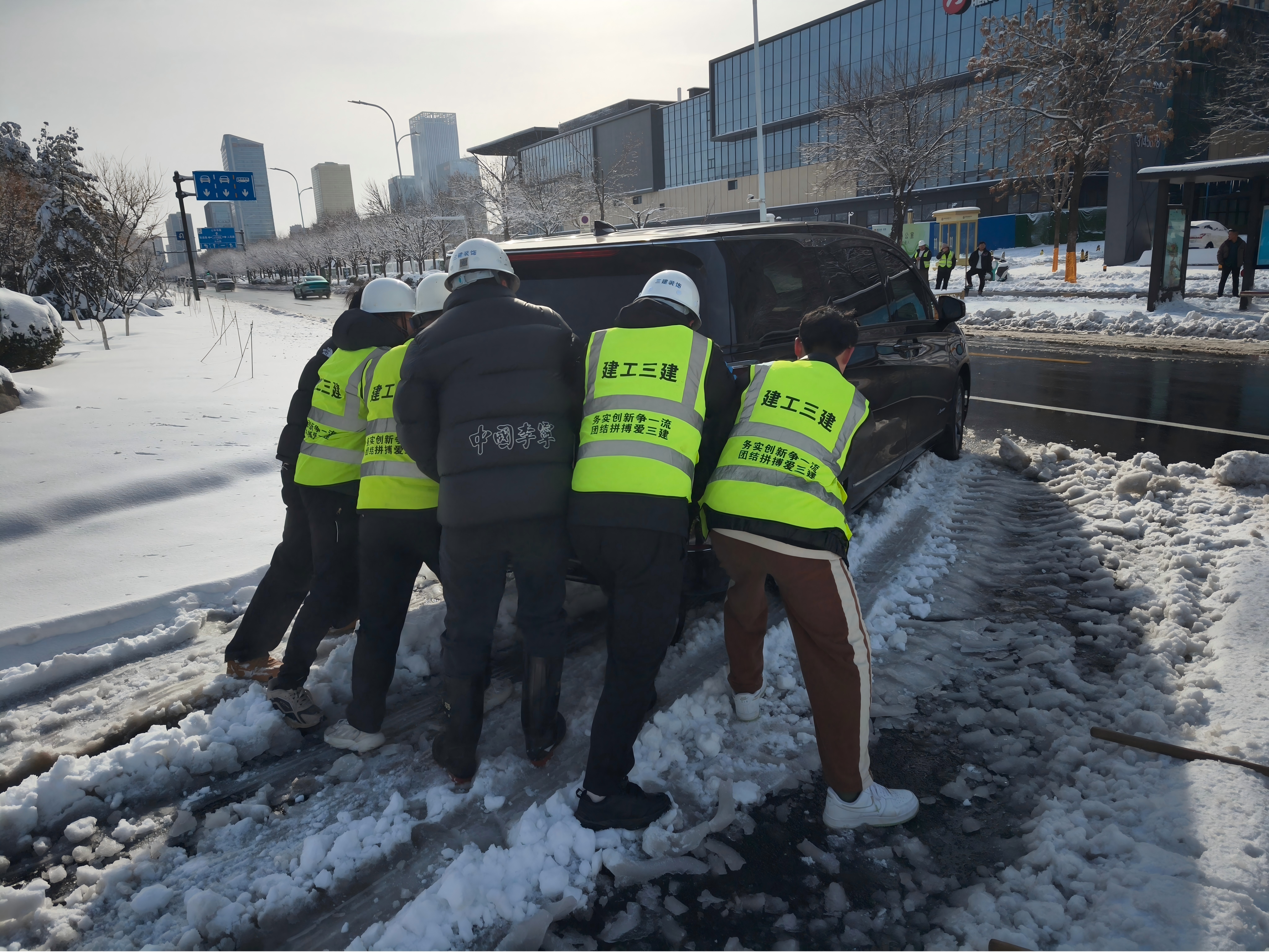 項目黨員同志帶領(lǐng)職工群眾不畏嚴(yán)寒,手持鐵鍬,一鏟一鏟地清理著項目周邊道路及工作區(qū)域的積雪,全力保障施工安全和居民正常通行。在鏟雪過程中,項目管理人員為協(xié)助車輛被困的路人,仔細(xì)清除車輛周圍及車輪下的積雪障礙,指揮路人緩慢駕駛,最終成功幫助車輛脫困。