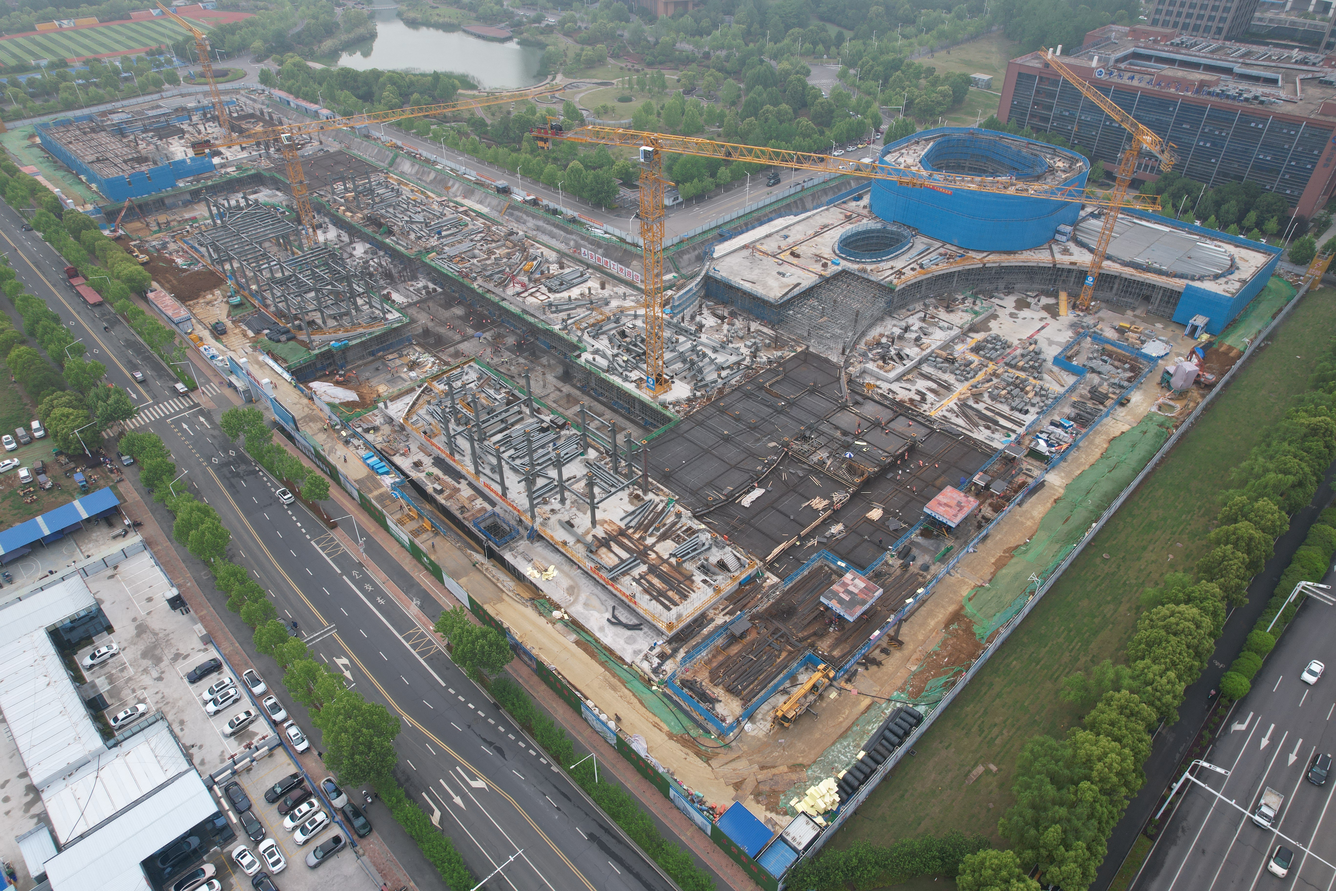 中國(guó)科大科技商學(xué)院項(xiàng)目位于合肥市高新區(qū),總建筑面積18.31萬(wàn)平方米,建設(shè)內(nèi)容包括1#商學(xué)院主樓、2#綜合服務(wù)樓及地下車庫(kù)。該項(xiàng)目建成后將以中國(guó)科大雄厚的學(xué)科優(yōu)勢(shì)為基礎(chǔ),大力培養(yǎng)“懂科技、懂產(chǎn)業(yè)、懂資本、懂市場(chǎng)、懂管理”的復(fù)合型科技產(chǎn)業(yè)組織人才,助力安徽打造具有重要影響力的科技創(chuàng)新策源地和新興產(chǎn)業(yè)聚集地。截至目前,項(xiàng)目地下室結(jié)構(gòu)已封頂,1#樓B區(qū)報(bào)告廳已封頂,網(wǎng)架2已完成提升。1#樓A區(qū)商學(xué)院主樓及2#綜合服務(wù)樓進(jìn)行2層結(jié)構(gòu)施工。