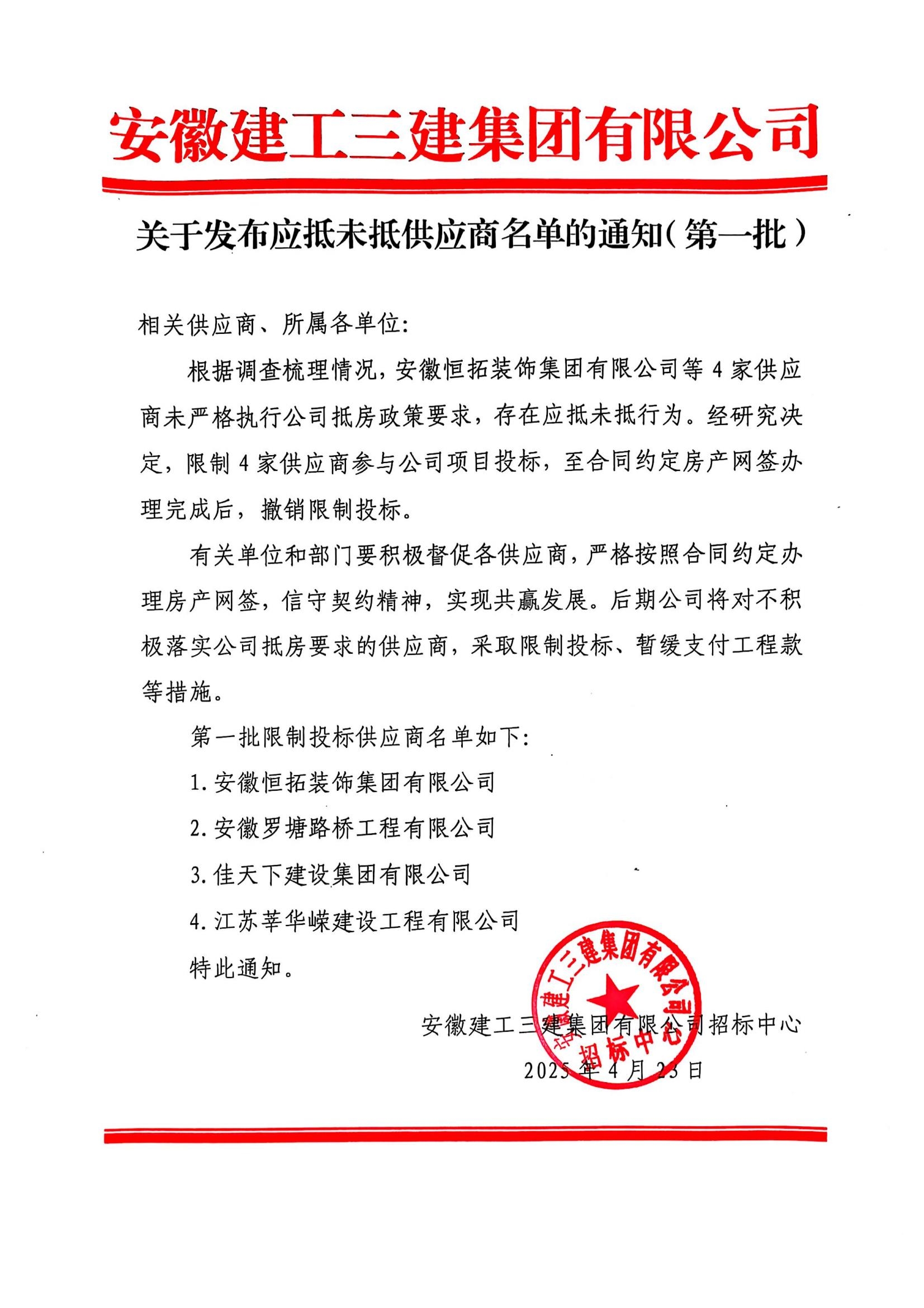 關(guān)于發(fā)布應(yīng)抵未抵供應(yīng)商名單的通知(第一批)