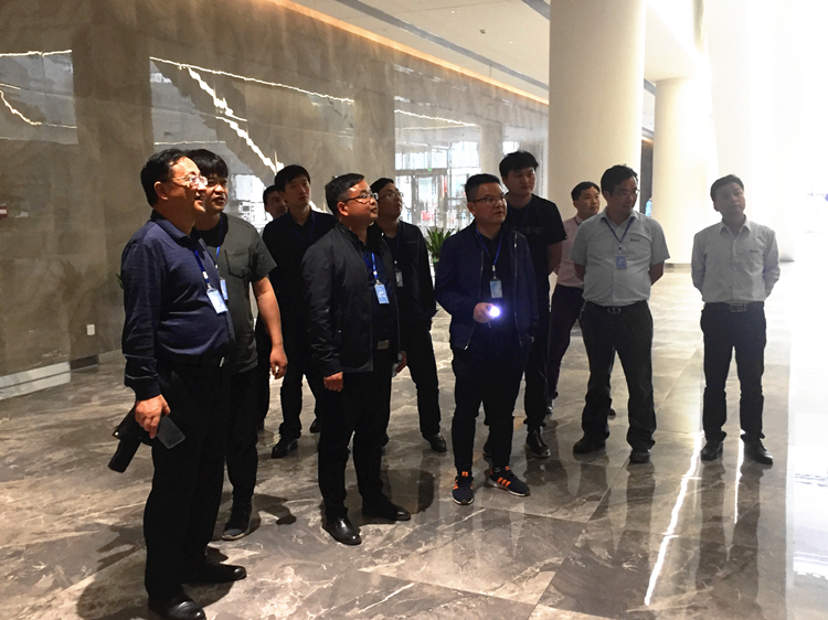 觀摩中,孫俊中對所有項(xiàng)目人員表示親切的慰問,在現(xiàn)場聽取了項(xiàng)目負(fù)責(zé)人王皖對安徽創(chuàng)新館整體建設(shè)情況介紹。隨后孫俊中一行參觀了二號(hào)館、三號(hào)館。裝飾公司項(xiàng)目經(jīng)理劉維向觀摩團(tuán)介紹了二號(hào)館室內(nèi)環(huán)氧磨石工藝、PVC石塑地板鋪貼技術(shù)以及三號(hào)館全球路演中心超大型藝術(shù)造型鋼板安裝技術(shù)等等。館內(nèi)光可鑒人的環(huán)氧磨石地面、輕質(zhì)飄逸的穿孔鋁板、氣勢宏偉的路演中心給孫俊中一行留下深刻印象。
