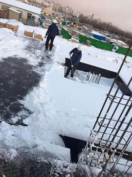 截至12月7日,煙臺市持續(xù)降雪一天一夜,安徽三建大連公司承建的煙臺力高二三四期項(xiàng)目現(xiàn)場覆蓋上了厚厚的積雪,臨建區(qū)域的積雪足足達(dá)到15厘米,為了保證施工生產(chǎn)安全,項(xiàng)目人員冒著零下四度的嚴(yán)寒,頂著飛舞的雪花,拿著鐵鏟和掃帚等清掃工具清除項(xiàng)目積雪。他們分工協(xié)作,有的鏟雪,有的清掃,有的堆碼。大家的臉和手雖然被凍得通紅,但是臉上都洋溢著勞動(dòng)的喜悅。經(jīng)過幾個(gè)小時(shí)的團(tuán)隊(duì)作戰(zhàn),院內(nèi)的積雪全面清除,確保了辦公安全。
