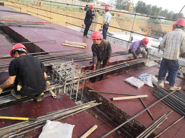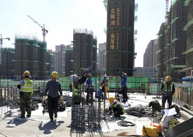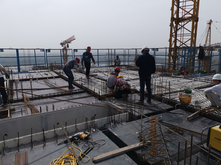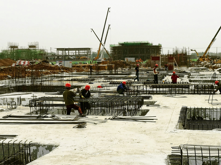 5月2日,十一公司天長(zhǎng)恒大I標(biāo)項(xiàng)目班組綁扎基礎(chǔ)承臺(tái)鋼筋。