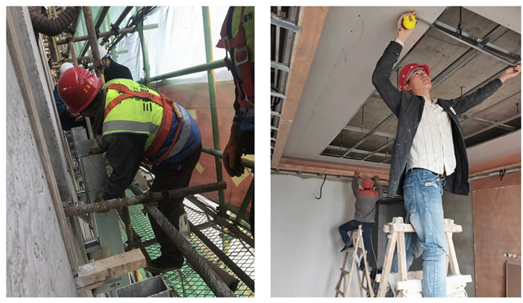 裝飾公司肥東政府中心項(xiàng)目:五一期間正在開展主龍骨角碼安裝作業(yè)以及銅川悅豪酒店項(xiàng)目職工進(jìn)行頂面木制作。