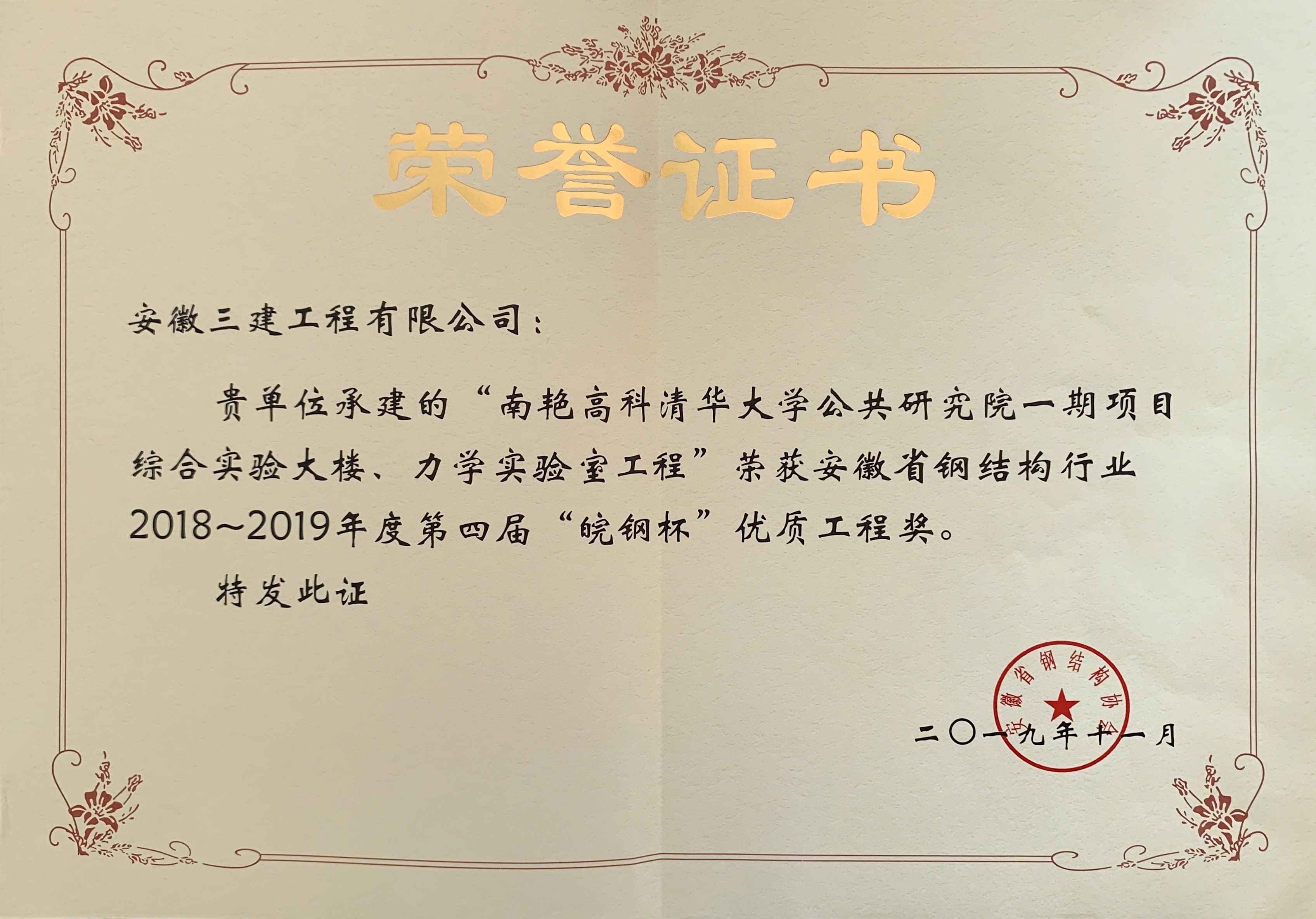 近日,安徽省鋼結(jié)構(gòu)協(xié)會(huì)公布第四屆(2018~2019 年度)“皖鋼杯”獲獎(jiǎng)名單,安徽三建工程有限公司榜上有名,由裝飾公司負(fù)責(zé)施工的南艷高科清華大學(xué)公共研究院一期鋼結(jié)構(gòu)項(xiàng)目榮獲“皖鋼杯”優(yōu)質(zhì)工程獎(jiǎng),這也是我公司首次榮獲鋼結(jié)構(gòu)工程類獎(jiǎng)項(xiàng)。
