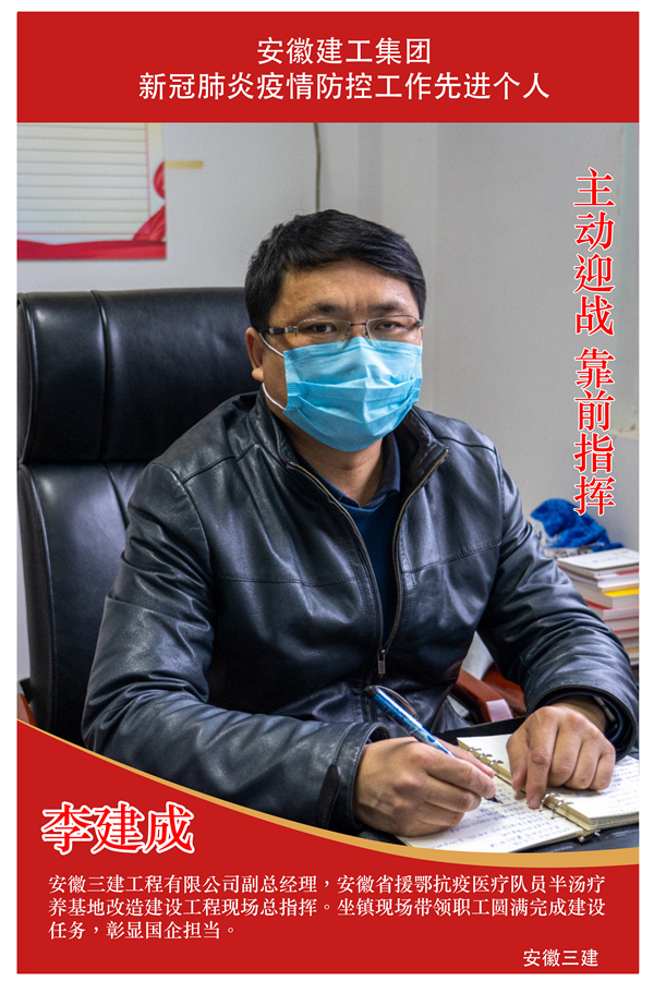 李建成,安徽三建工程有限公司副總經(jīng)理,安徽省援鄂抗疫醫(yī)療隊(duì)員半湯療養(yǎng)基地改造建設(shè)工程現(xiàn)場(chǎng)總指揮。在攻堅(jiān)抗疫應(yīng)急工程的戰(zhàn)斗中,他勇?lián)?zé)任,靠前指揮,連續(xù)14天坐鎮(zhèn)現(xiàn)場(chǎng)指揮調(diào)度,迅速解決現(xiàn)場(chǎng)遇到的材料供應(yīng)和勞務(wù)人員組織、出行、防疫物資供給等困難,為按期圓滿完成省援鄂抗疫醫(yī)療隊(duì)員半湯療養(yǎng)基地改造工程起到了關(guān)鍵性的作用,彰顯了國(guó)企領(lǐng)導(dǎo)的使命擔(dān)當(dāng)。