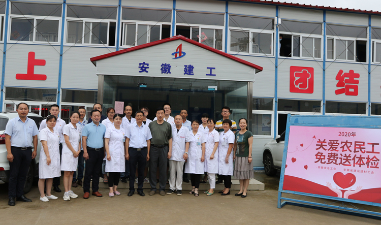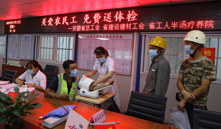 7月13日,由安徽省總工會組織,省建設(shè)建材工會、省工人半湯溫泉療養(yǎng)院承辦的“關(guān)愛農(nóng)民工、免費送體檢”活動來到安徽三建合肥市中心圖書館項目,為項目近120名現(xiàn)場農(nóng)民兄弟工進(jìn)行了體檢。