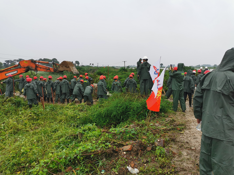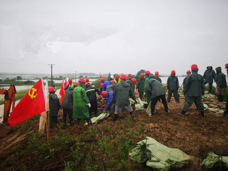 7月19日12點,十公司動力三村項目部成立黨員先鋒突擊隊參與大房郢水庫筑堤沙袋運輸抗洪搶險工作