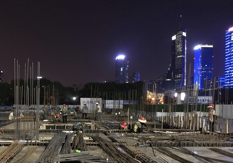 合肥市中心圖書館項目是合肥市重點工程,為保證施工進(jìn)度,項目部不僅備好涼白開、礦泉水、綠豆湯、還有仁丹等解暑物品,錯開上午10點至下午3點白天高溫時間段進(jìn)行施工,還將農(nóng)民工學(xué)校教室及會議室空調(diào)全天開啟,以備工人休息使用。圖中是在華燈初上的天鵝湖畔,廣大工人師傅正在進(jìn)行地庫鋼筋綁扎及外架搭設(shè)工作。