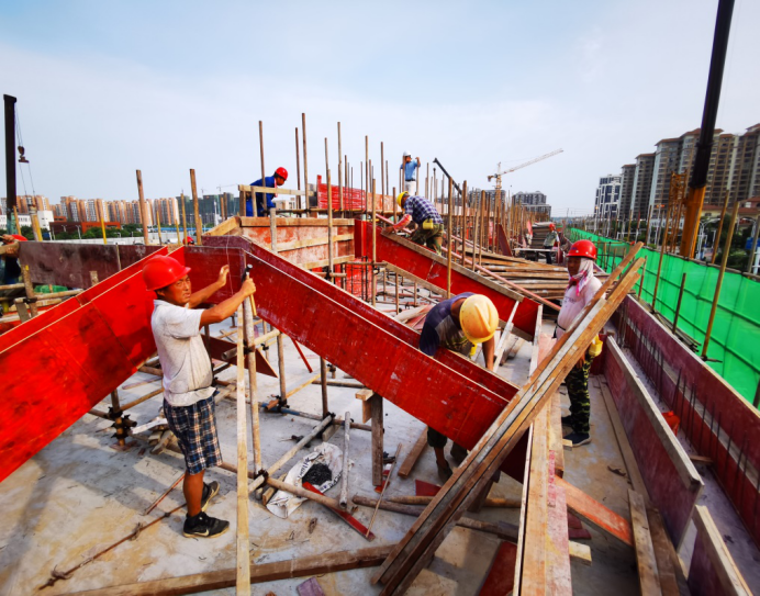下午4點,室外溫度依然居高不下,在安徽三建五公司東城悅苑項目現(xiàn)場,工人師傅正在支模搶工期