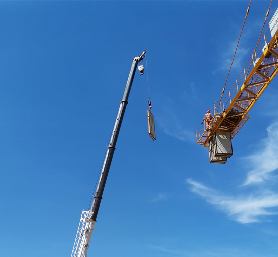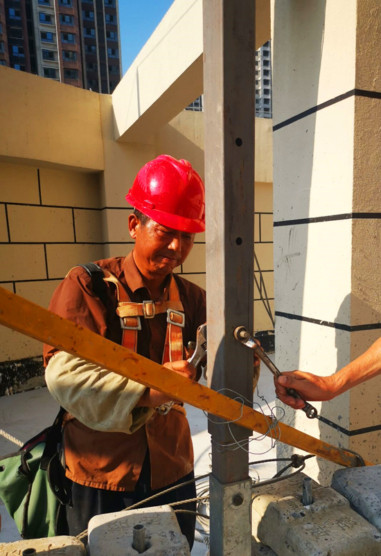 設(shè)備租賃公司吳金國等派駐六安一中項目班組冒著炎熱高溫,熱浪滾滾天氣,揮汗如雨,上衣汗透,堅持把十多臺塔吊裝好